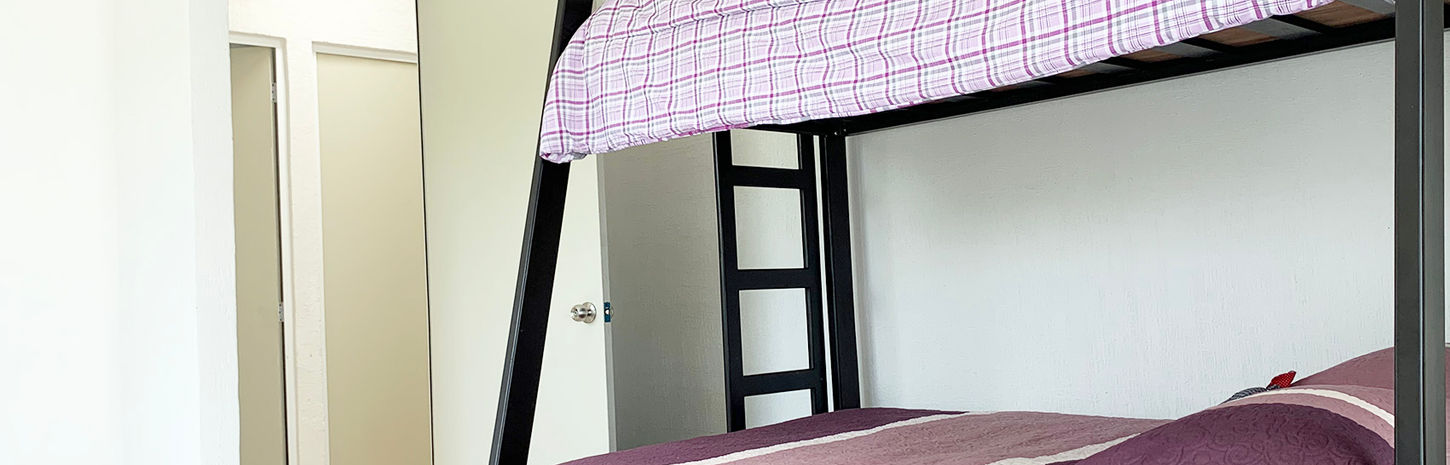 La casa cuenta con 3 habitaciones y todas tienen literas para una distribución adecuada si viaja con toda la familia, dos habitaciones tiene aire acondicionado propio y la tercera lo comparte con la planta baja. Hay un baño completo y un medio baño.